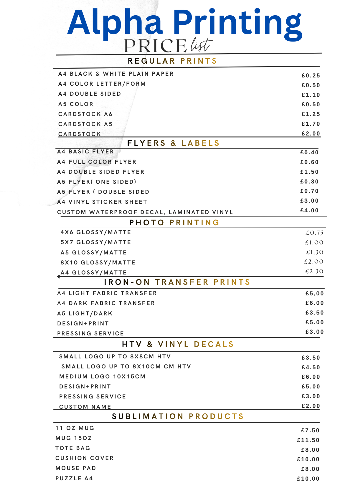 Find below our printing service pricess
